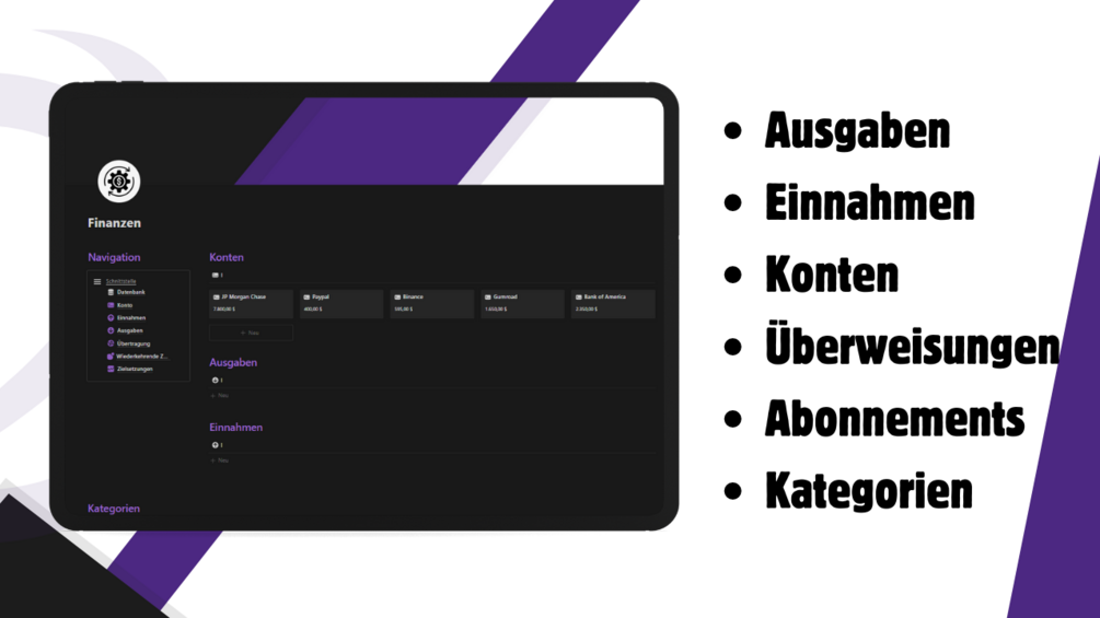 Holen Sie sich die Vorlage "Finanzen" von Notion und beginnen Sie noch heute, Ihr Finanzleben zu verändern! Lassen Sie sich nicht von mangelnder Organisation davon abhalten, Ihre finanziellen Ziele zu erreichen. Mit diesem Tool haben Sie alles, was Sie brauchen, um Ihre Finanzen umfassend und effektiv zu verwalten - fangen Sie jetzt an und übernehmen Sie die Kontrolle über Ihre finanzielle Zukunft!